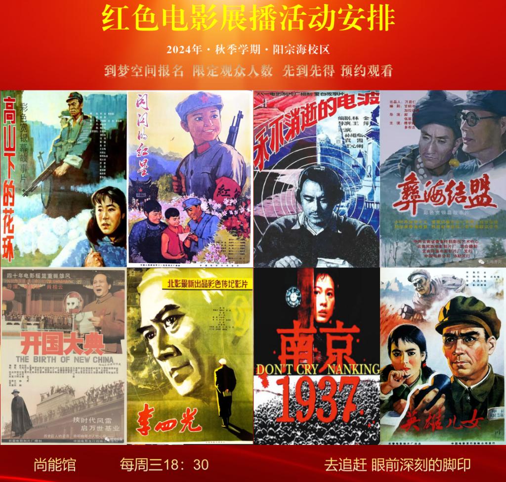 为贯彻落实《党史学习教育工作条例》,深入实施时代新人铸魂工程,运用好传承好红色基因,推动党史学习教育常态化长效化,教育引导广大青年学生在感悟中国共产党人精神谱系、体悟中华人民共和国成立75周年光辉历程中传承红色基因、赓续红色血脉,努力成长为担当民族复兴重任的时代新人。马克思主义学院组织开展红色电影放映活动。现将有关事宜通知如下: