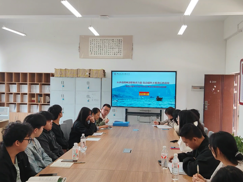 其他同学进行了交流发言。李文斌同学说,学习习近平总书记重要讲话后,我深刻认识到“民族要复兴,乡村必振兴”的内涵。云南作为多民族边疆地区,乡村振兴需兼顾经济发展与文化传承,在未来我将结合专业和特长,探索如何通过数字化平台推广乡土文化、连接城乡资源,让乡村振兴既有“烟火气”更有“时代感”,以实际行动践行习近平总书记“让人民生活像花儿一样幸福、和美”的嘱托。