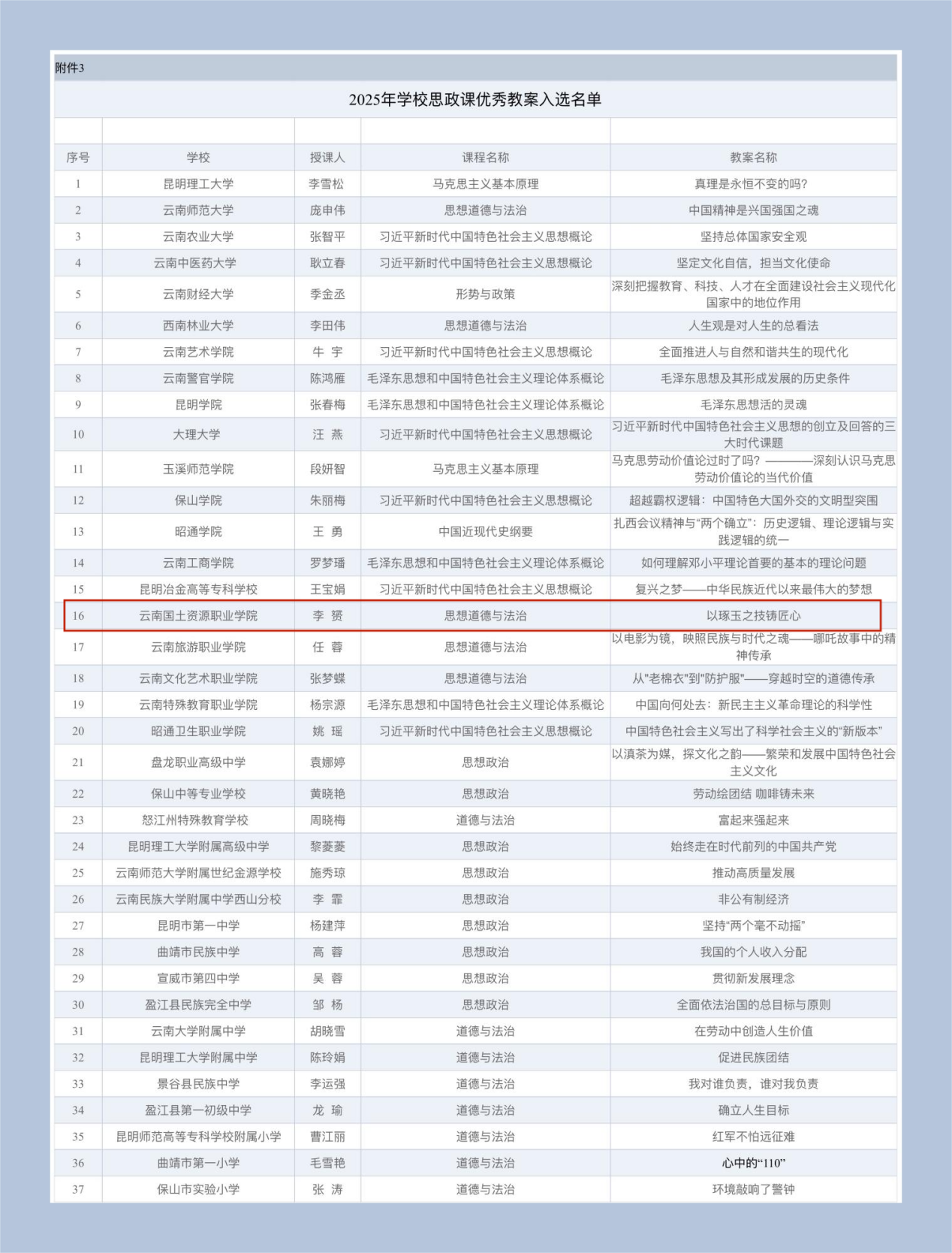 由云南省委教育工委组织开展的云南省学校思政课名师工作室、精品课程、优秀教案遴选工作圆满落幕。今年会官网马克思主义学院思政课教师李赟老师教案《以琢玉之技铸匠心》入选2025年云南省学校思政课优秀教案。